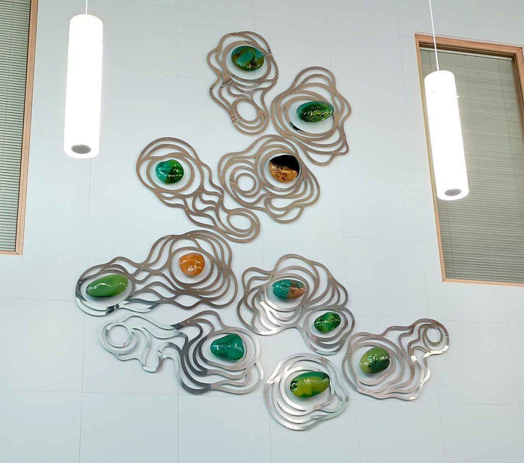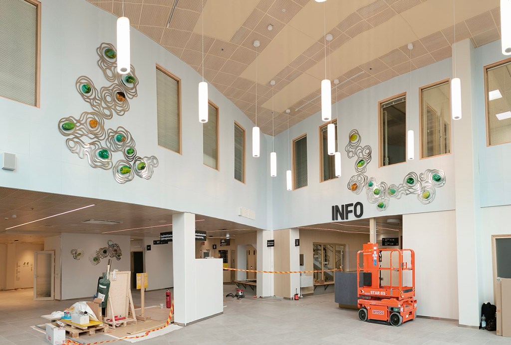 Public artwork “Nobody is an island” was installed at Tyks Compass Hospital, Turku, Finland in the beginning of July 2024. The work consists of laser cut of bright annealed stainless steel shapes and hand blown glass objects. It is installed on three walls of the main foyer of the psychiatric hospital. Compass Hospital will open at the end of 2024.