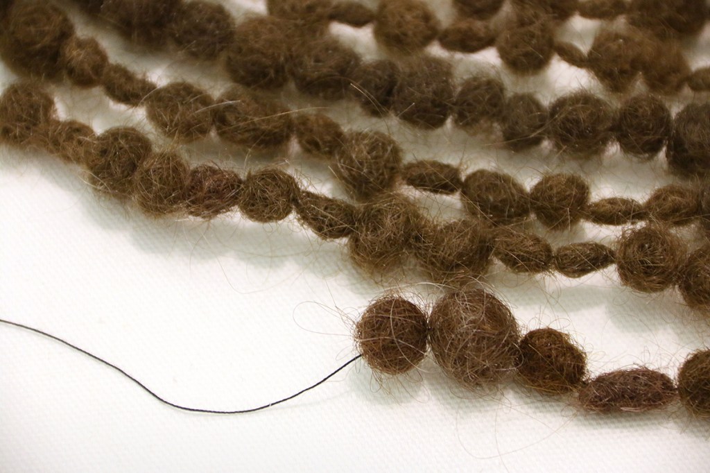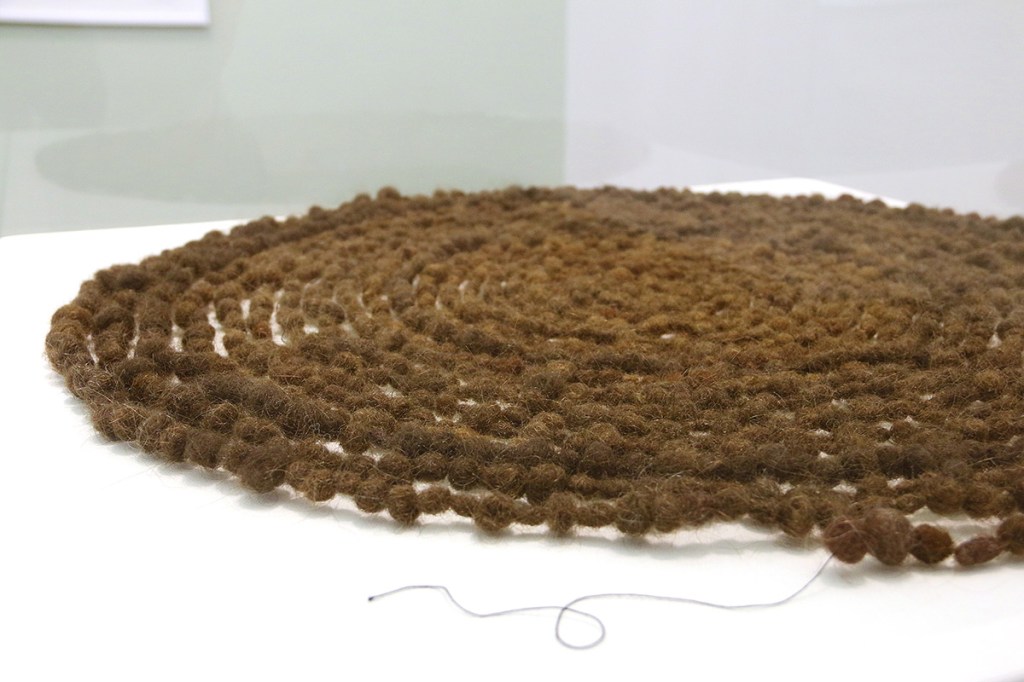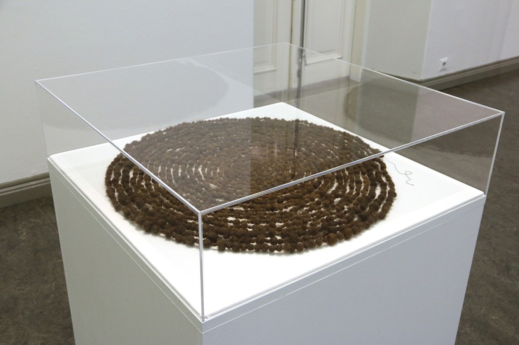 I started collecting my hair in 2005. When I wash my hair in shower, some of the hair gets loose and sticks on my fingers – I started spinning them into balls so they wouldn’t clog the sewer. The balls accumulated. The color of the balls has changed slightly over the years, now the white hair comes along slowly. The number of hairballs shows the passage of time and aging. I make a long pearl string out of my hairballs, and twist that string into a spiral. The spiral shape occurs in nature for example in human DNA. As a symbol, the spiral means e.g. growth and the cycle of nature. Collecting the hairballs continues. I hope I get old enough for the balls on the outer edge of the spiral to slowly turn white.