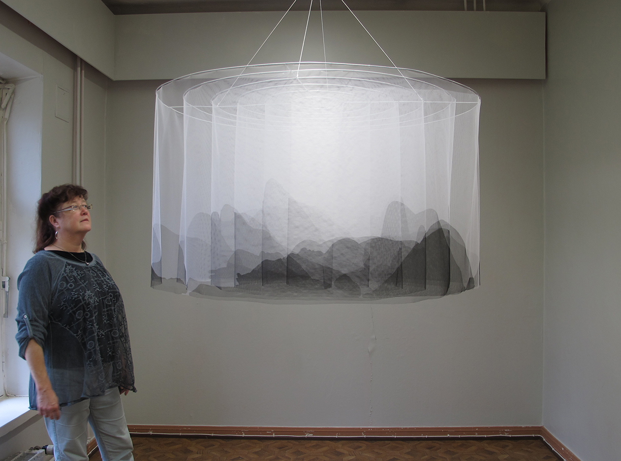 Materials: tulle fabric, ink and metal. Dimensions: diameter 120 cm, height 70 cm.