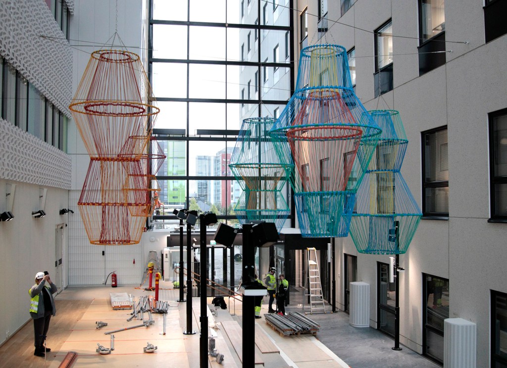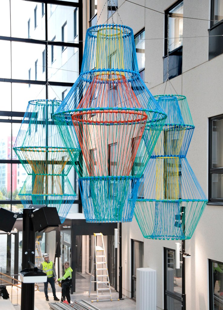 Public art work Tiedon rysät was installed in September 2021 in a new Lighthouse hospital in Turku, Finland. The hospital has a nautical overall theme in its design. The shapes of my work take inspiration from fyke net, the fishing equipment. Tiedon rysät consists of five separate “fykes”. Their materials are stainless steel rings and coloured ropes. All pieces have different size, the diameter of the fykes are 120 – 180 cm and heights 250 – 350 cm. The building of the hospital will finish in the end of 2021, and it will open to public in February 2022.